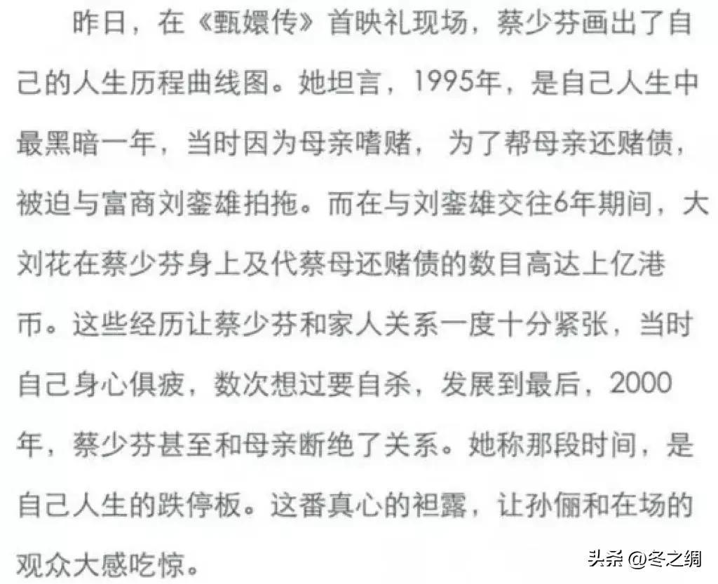 以《后宫·甄嬛传》中的皇后一角火遍中国的香港演员蔡少芬,童年并不算幸福。