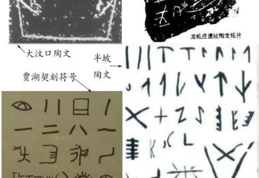 我国境内便曾发现了大量的陶文和刻符,例如在山东诸城大汶口文化遗址出土的,距今已经4500多年的“大汶口陶文”;又如在江苏高邮龙虬庄遗址出土的,比甲骨文早一千多年,刻于陶盆内壁上的“高邮陶文”;再如在西安半坡村的半坡遗址出土的,刻画在陶钵口沿上,距今已经6000余年的“半坡陶符”;还有河南贾湖遗址发现的,早于安阳殷墟甲骨文4000多年的“贾湖契刻符号”。