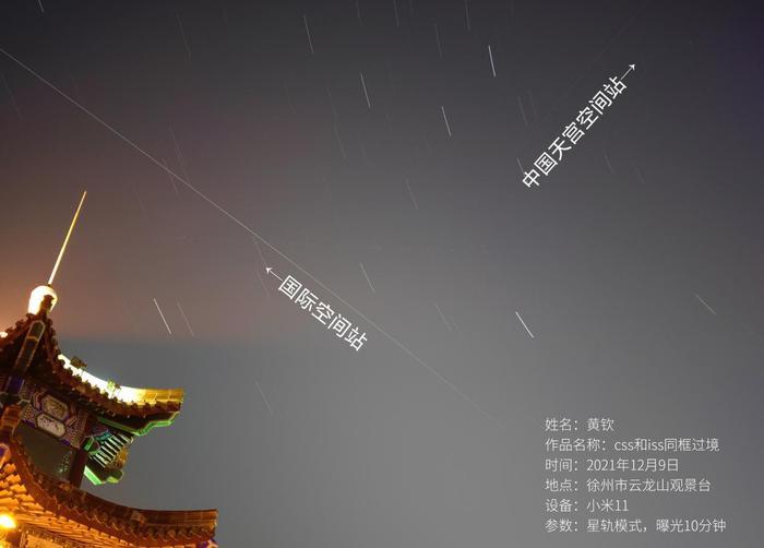 在山顶待了两个多小时,终于拍到了中国天宫空间站和国际空间站的合影,可能中国空间站低空时比较暗,并没有如愿拍到两者交叉过境的照片。