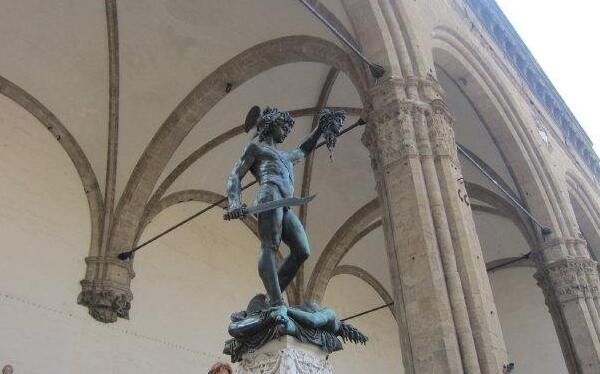 帕修斯在天空中,仍然手提着美杜莎的头,一副英武气概,这就是帕修斯与美杜莎的人头雕像。而对此雕像,有这样一个故事:美杜莎,古希腊神话中的蛇发女妖,她的每根头发都是毒蛇,谁要是被她看上一眼,就会变成一块石头。