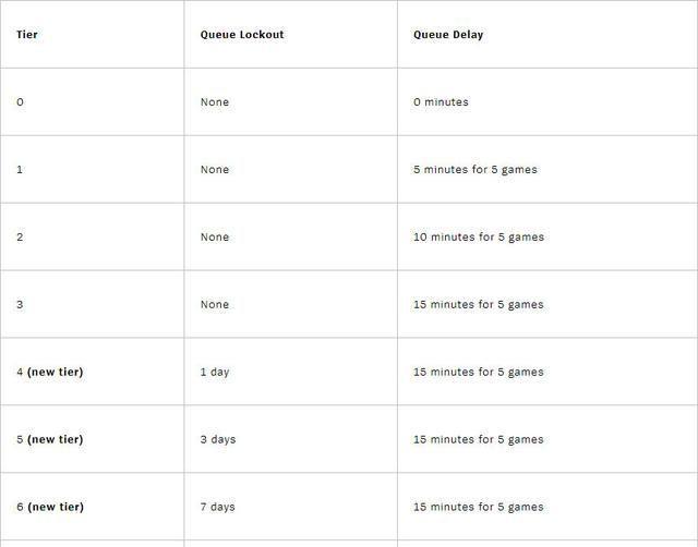 于是拳头决定采用新的惩罚方式,挂机玩家将会迎来1-14天的封禁处罚。当某位玩家挂机次数越多,惩罚等级将越高,让挂机和中途离开的玩家受到更严重的惩罚,最高封禁14天。拳头希望以此方式来保护正常游戏的玩家不受频繁违规的玩家影响游戏体验。同时拳头也考虑到有些玩家也许是因为网络连接问题而遭受惩罚,因此目前该功能仍未在全服上线。