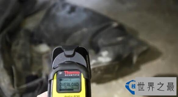 而当小哥靠近当年消防员的衣物时,盖格计数器的鸣叫声由急促变成了长鸣,数字也从1500微西弗每小时直线上升至“OVERLOAD!”爆表了!此时摄影机也开始受到干扰,小哥说话的声音也变的含糊不清,太可怕了!