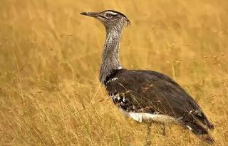 灰颈鹭鸨又名柯利鸟,是世界上最大的飞鸟。分布于非洲东部和安哥拉、南非等地。栖息于草原等环境中,成小群活动,以植物的老树皮,树枝等为食。繁殖期为2~9月,营巢于原野地面上,每窝产卵2枚。