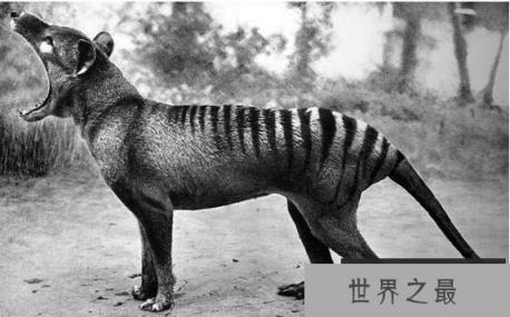 塔斯马尼亚虎(袋狼),是世界近代史上最大的食肉性有袋类哺乳动物,并不是袋鼠,别弄错了。袋狼的体长约在1.8米左右,身高在60公分左右,体重一般是重达60斤,身材非常的纤瘦,但是却有超强的咬合力,一口下去就能将猎物的颅骨咬碎。1933年有人捕获一只袋狼,命名为班哲明,饲养在赫巴特动物园,1936年因管理员疏忽曝晒而死亡,此后再没有活袋狼存在的消息。