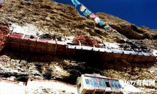 西藏的倒悬空寺,位于阿里普兰县西北方向的悬崖之上,高出地面约30米。该寺坐北朝南,阿里四大著名河流之一的孔雀河就在脚下缓缓流过。站在悬空的寺庙栈道上,可以俯瞰普兰县全貌,远处的雪山、河流也尽收眼底。倒悬空寺藏语称“空琵贡巴”,意思是“飞来寺”,又叫“悬空寺”。
