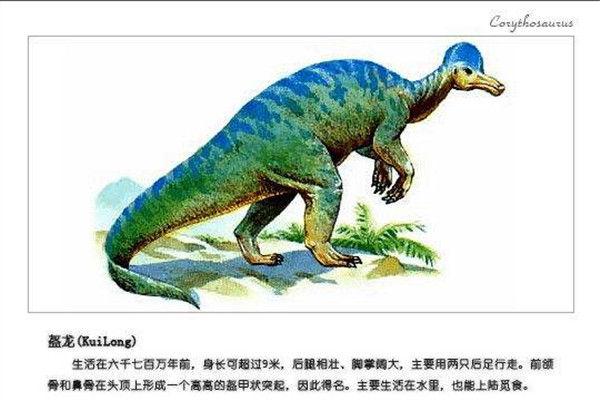 盔龙别名叫做冠龙、也叫鸡冠龙、还叫盔头龙以及盔首龙,含义就是头盔蜥蜴。这种恐龙属于鸭嘴龙科,也是脊索动物。盔龙和很多恐龙一样同样来自于白垩纪,距离现在大概有七千万年。同样也属于一种比较大型的恐龙,在北美洲一带生存着。