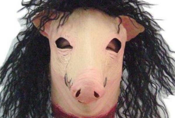 出自恐怖片《电锯惊魂》中的猪脸面具也是非常恐怖的,这个面具整个就是一猪脸,但它有着一双空洞洞的眼睛,同时还有一头人的长发,配上变态杀人犯,简直恐怖如斯啊!