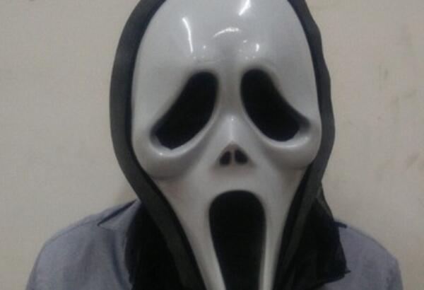 该面具来源于电影《惊声尖叫》,里面的面具杀手,每次带着这样的面具杀人,被杀者往往都被面具先吓个半死!