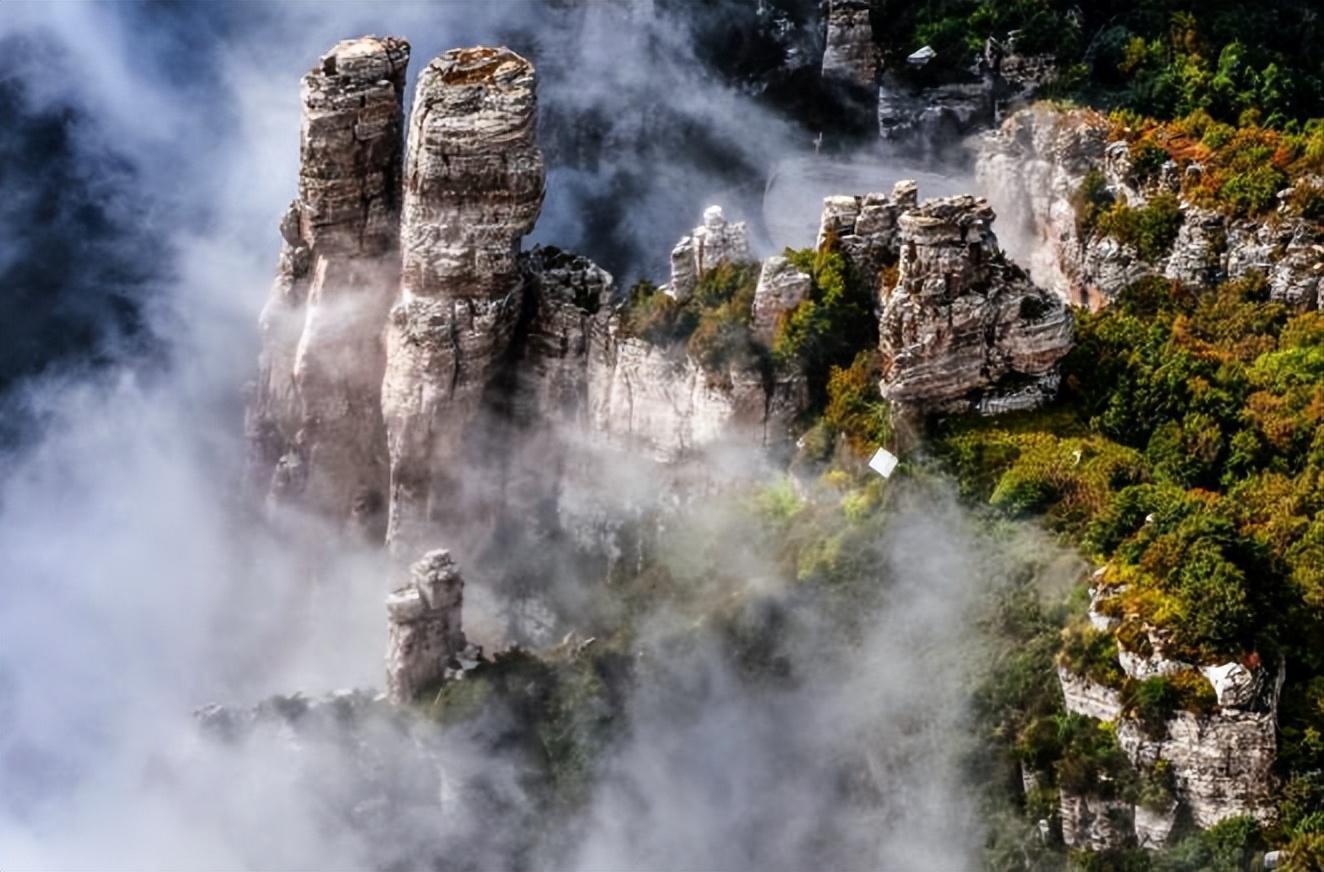 白石山最高峰佛光顶海拔2099米,号称“太行之首”,景区有“三顶、六台、九谷、八十一峰”,主脊线长7000 余米,最高峰海拔2096米,是华北平原西北隆起之龙首。