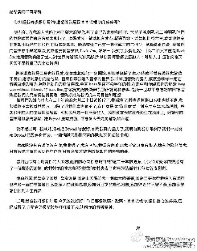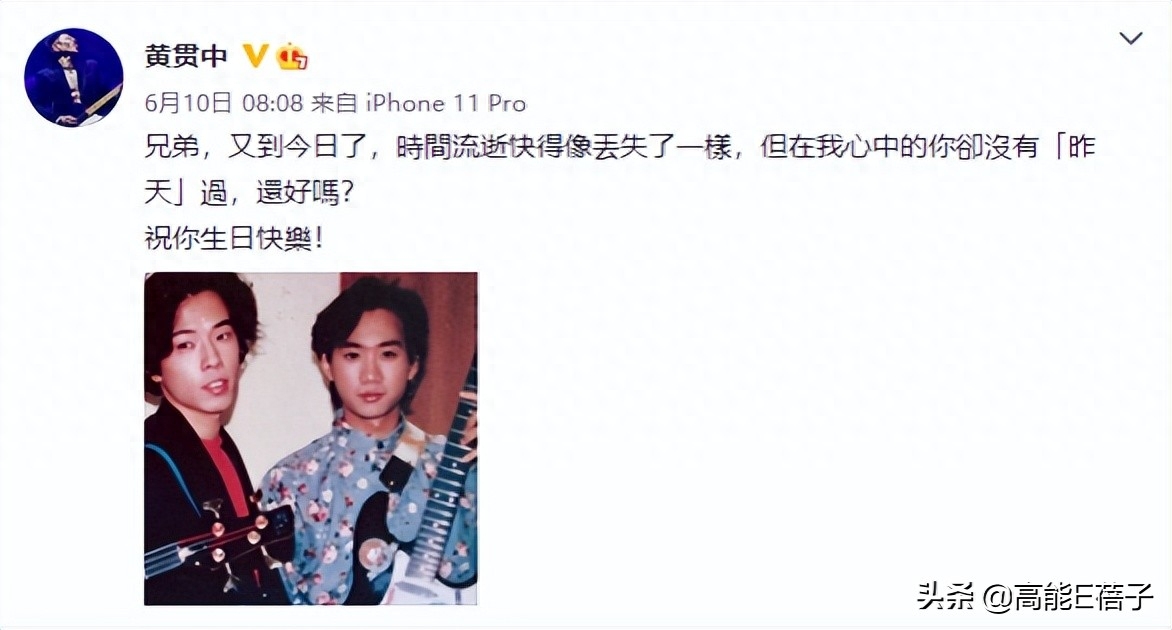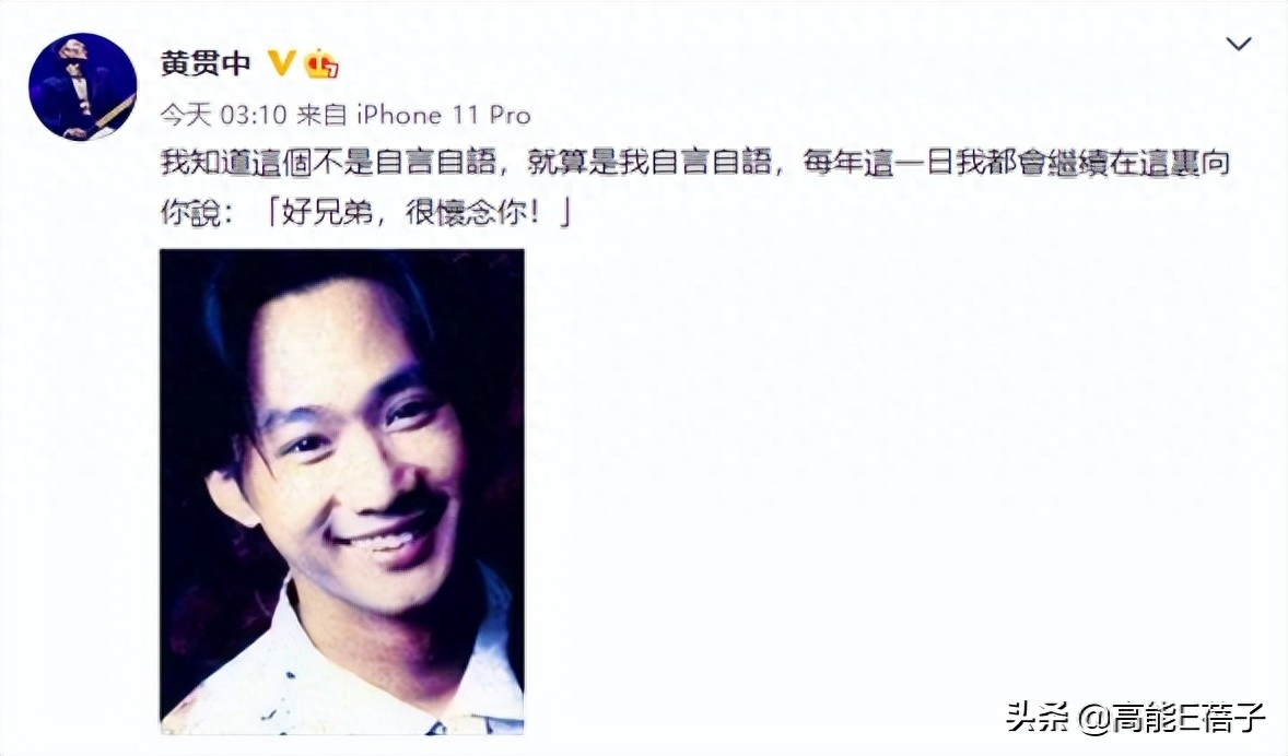 而黄贯中在凌晨3:10分社交平台上晒出一张黄家驹的旧照,发文缅怀好兄弟:“我知道这个不是自言自语,就算是我自言自语,每年这一日我都会继续在这里向你说:‘好兄弟,很怀念你!’”