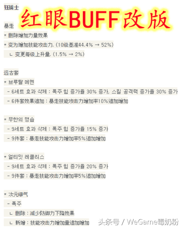 主要是删除暴走力量加成,然后改为技能攻击力(无冲突无稀释的最强属性)加成,红眼吧的大红神都狂欢了,以前增加力量和技能攻击力两种属性,而力量在带奶的情况会被稀释提升不高,比如你带奶已经2W力量再来个几百力量提升肯定不高啊,而技能攻击力就不一样了,所以此次红眼暴走BUFF的改版,对于大红神又是一次加强,DNF的某句话说的真对啊:一代版本一代神,代代版本都有大红神!