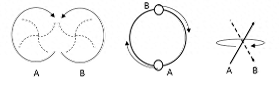 这三张图是从三个不同的视角观察的结果。第一张图是站在基子运动方向上,可以看到两个基子的旋转方向是相对的,构成的作用场,一端是向内吸附,另一端则是向外拨开;第二张图是俯视象子环,两个基子以相同速度你追我赶,然而始终处于隔海相望的对视局面;第三幅图则是在两个基子的同一条直线上,会发现两个基子采用仰首或弓身的姿势在向前运动,而非挺直身躯在跑。