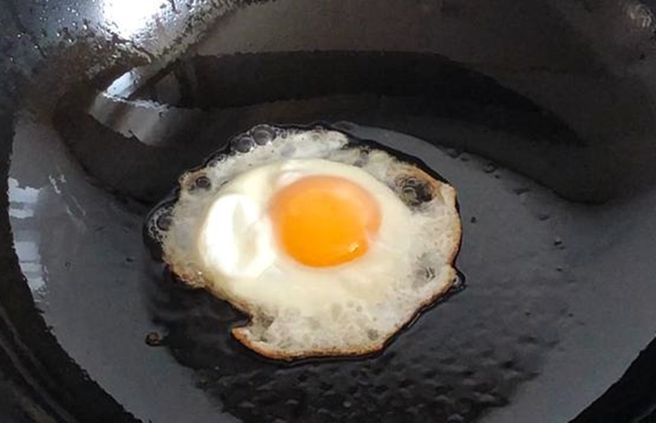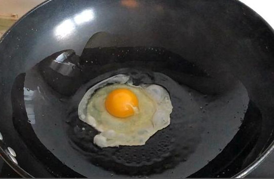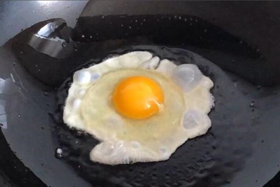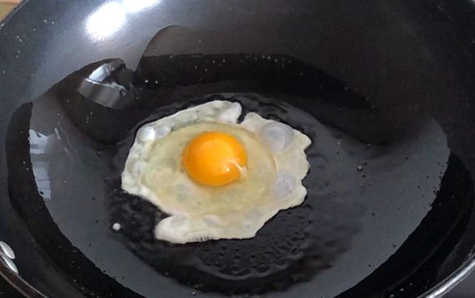 接下来就是油温的问题,是凉油还是热油煎呢?有人认为凉油会导致鸡蛋腥味重,有人认为热油很容易煎过火导致糊锅,其实油温问题不是关键,重点是要把锅烧热。