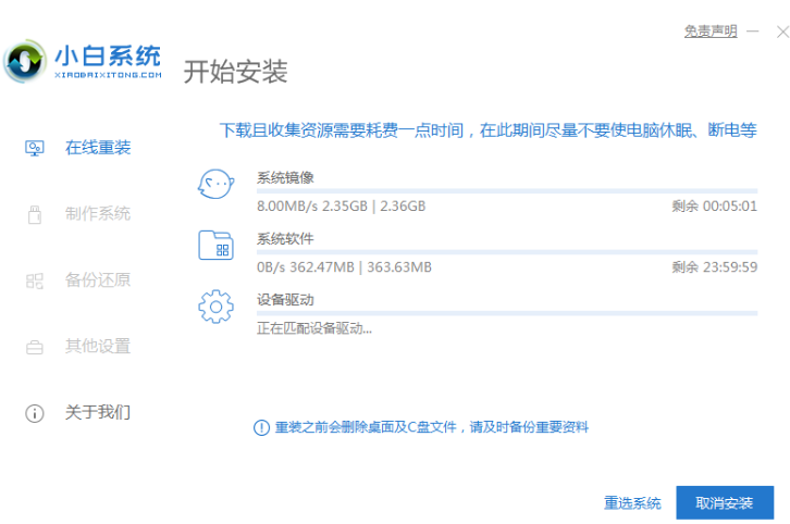 5.接下来小白就开始进行系统文件的下载。同时,若想换一个系统下载,则可以点击重选系统,进行取消更换。一般来说,近几年购买的新电脑是不支持xp系统的,不过老电脑还是选择xp系统比较好。