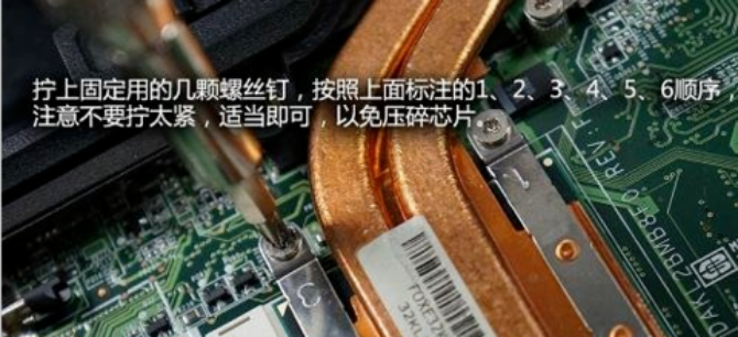 完成上述步骤后,您可以重新安装干燥的热管和散热器,但是不必担心拧紧螺钉,首先将散热器按在芯片上以查看接触是否良好,确保接触良好,然后然后拧紧,在安装螺钉时,请注意不要将其拧得太紧或太松。然后根据热管,散热器和螺钉进行安装。