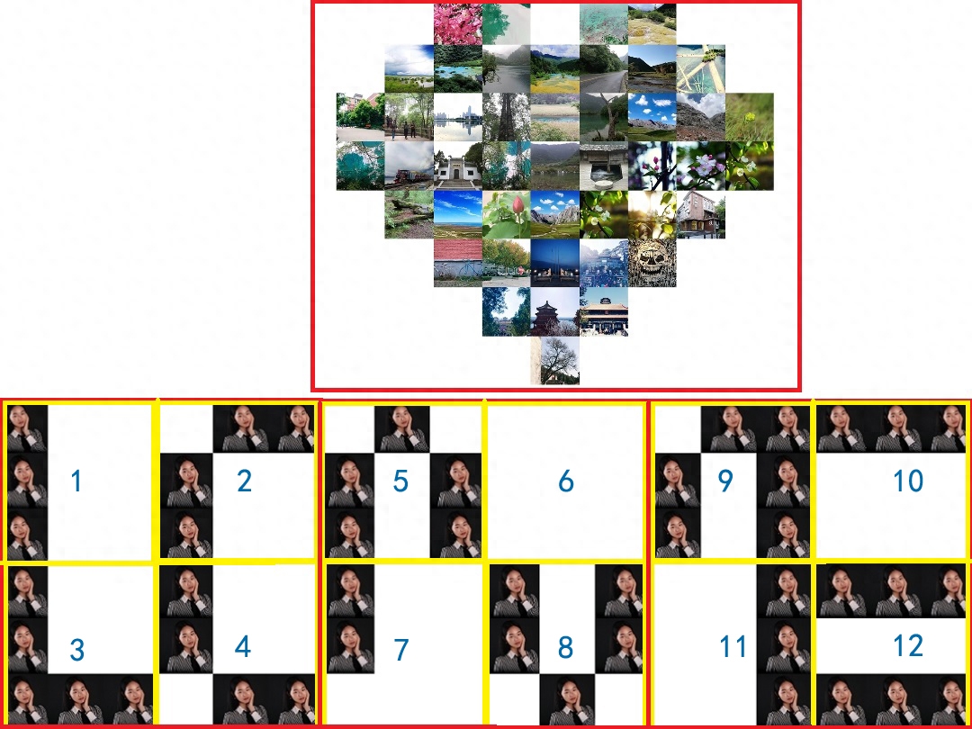 1、先使用九宫格拼图完成12个黄色框线里的内容,分别命名为图1-12。