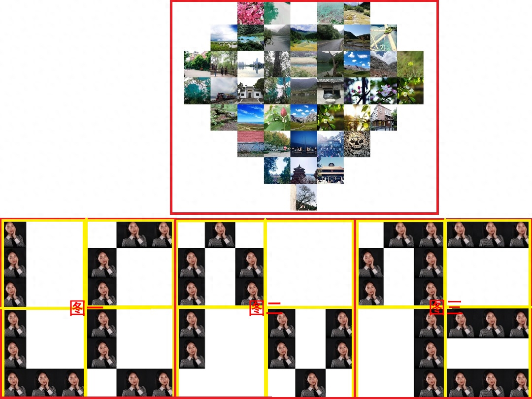 (2)分别使用我们刚刚拼好的1-4号九宫格照片完成图一,5-8号九宫格照片完成图二(6号九宫格为白色空白照片),9-12号九宫格照片完成图三。