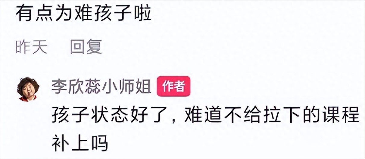 于是,有网友在视频底下为李欣蕊打抱不平,认为李欣蕊父母让孩子忍着病痛学习,实在太为难孩子了。但李欣蕊的父母却回复“孩子状态好了,就应该补上落下的课程。”语气虽然强硬严厉,但这话确实也没有错,父母当然也心疼孩子,可再心疼也不能不让她学习,这也是为了她好。