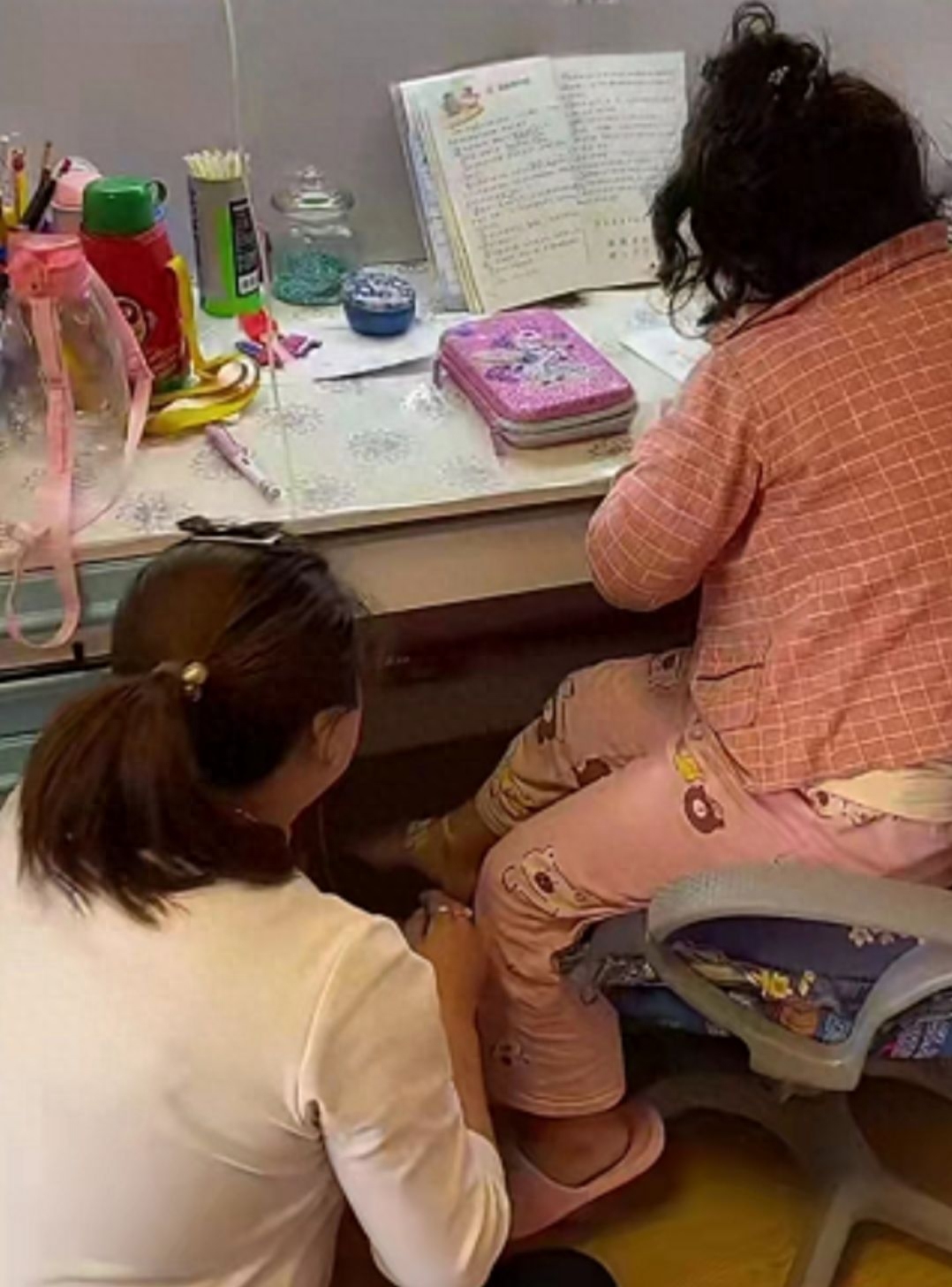 当时,李欣蕊正坐在书桌上认真地写作业,有人注意到她的脚上正在打着点滴,药瓶则挂在旁边,这样做大概是怕打在手上影响她做作业吧。做了一会儿作业,李欣蕊跟爸爸说想要去上厕所,但爸爸觉得这样不太方便,让她把针打完再去,小姑娘也很听话,继续转头乖乖写作业。