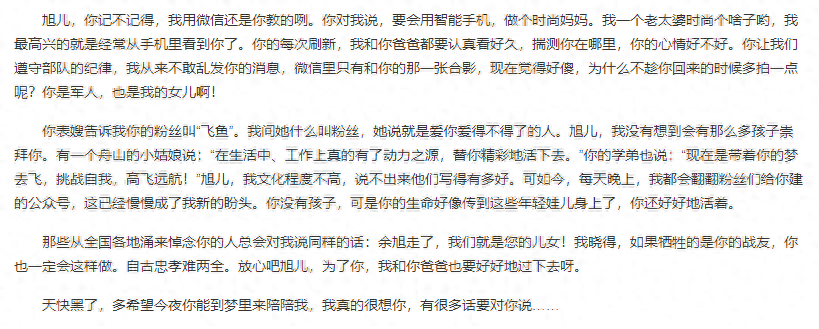 2017年3月,《解放军报》刊登了余旭母亲写给女儿的文章,名为《几曾萧雨入梦来》。语言真挚感人,惹人泪下。文章的最后一句是“多希望你能来梦里陪陪我,因为我真的想你······”此时距余旭去世快半年了。