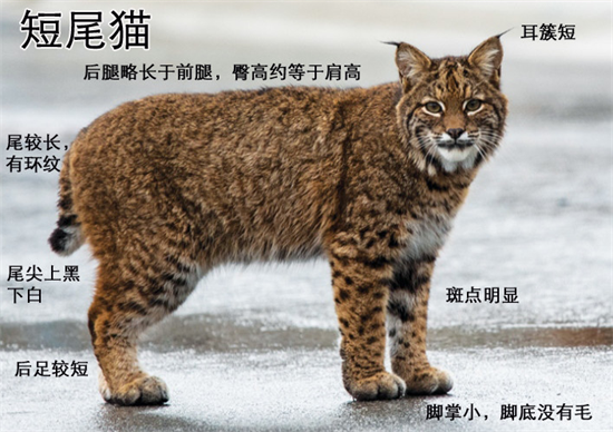 最后就是短尾猫了,短尾猫又称短尾猞猁,虽然其他猞猁的尾巴就已经够短了,但短尾猫的尾巴更短,看起来就像一个稍长一点球一样。从体型上看,短尾猫是最小的猞猁,它们的平均体长仅有80厘米左右,体重平均10公斤左右,从外观上看,短尾猫的毛发主要以灰褐色为主,前肢上有明显的黑带,眼睛黄色、鼻子粉红色。
