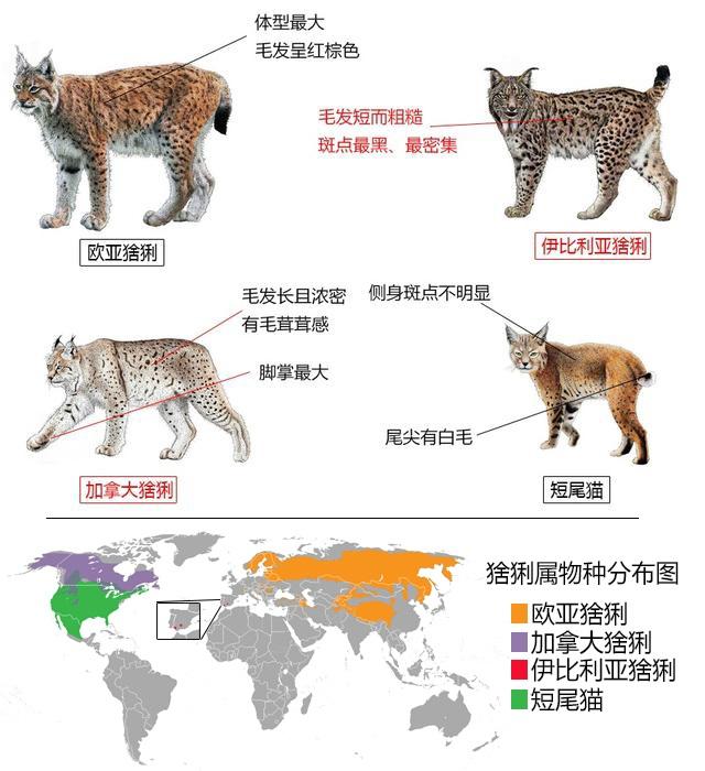 四种猞猁在分布上几乎是没有重合的,其中伊比利亚猞猁偏安一隅(伊比利亚半岛),加拿大猞猁分布在北美洲北部,短尾猫则分布在北美洲南部,而欧亚猞猁则广泛的分布于欧亚大陆上。