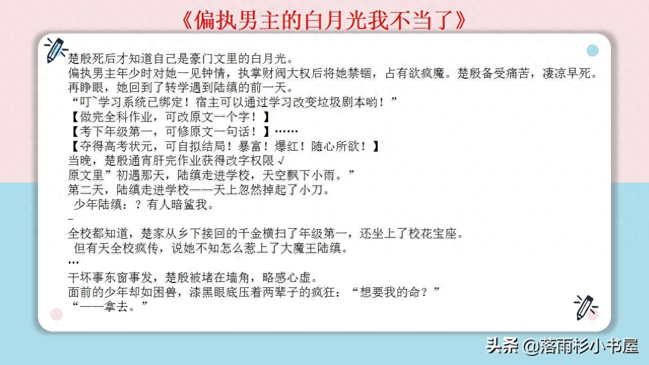 楚殷是小说里的短命白月光,上辈子在陆缜身边郁郁寡欢。死后重来,她拥有了一个能够通过学习篡改剧情的金手指。这辈子她不要再做短命的白月光,发奋学习,自立自强,这辈子逆天改命,最终揭开上辈子的谜团,拿稳幸福女主剧本。