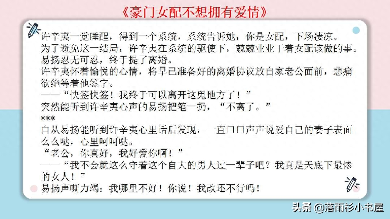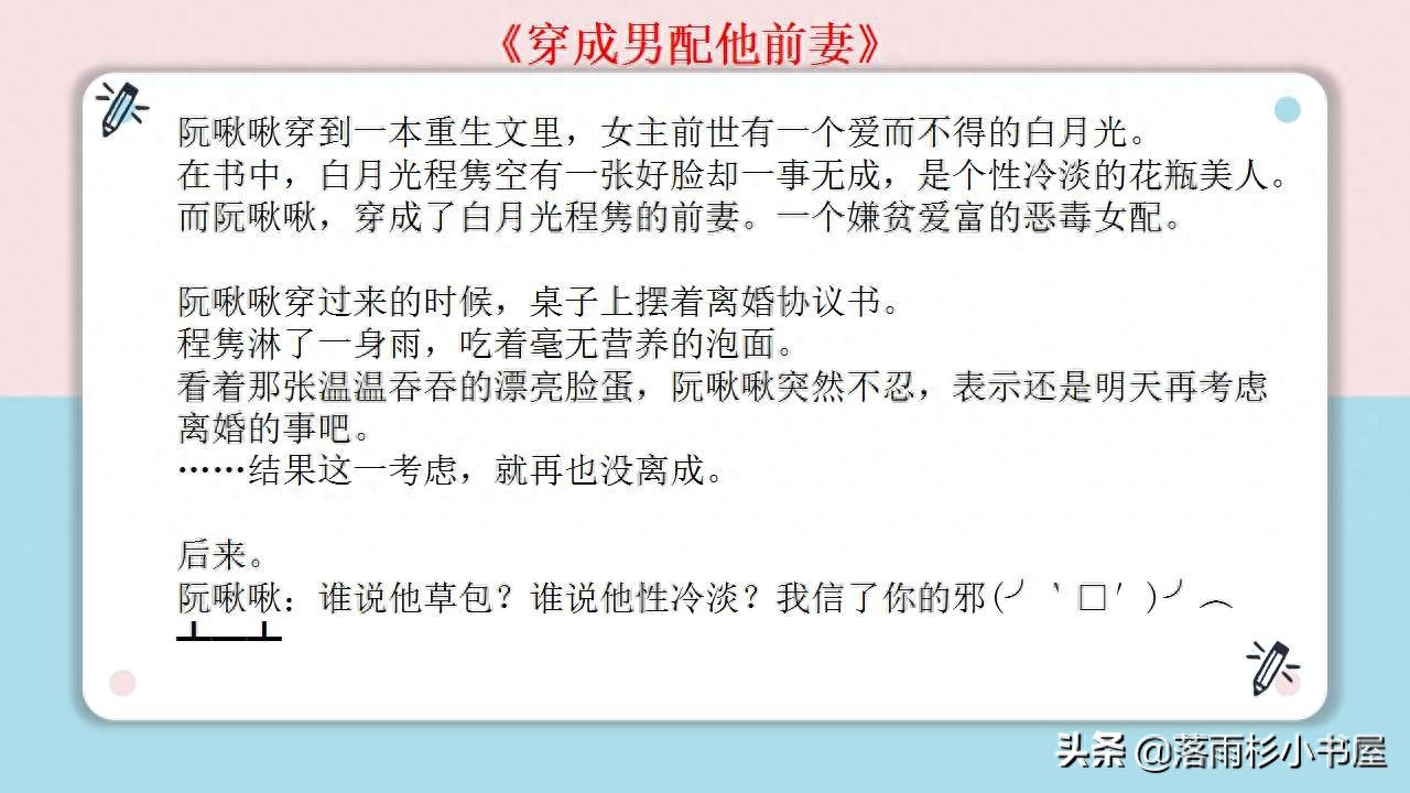 本文真的特别好看,女主穿成小说中的女配,在要离婚的时候觉得男主太可怜了就不离了,每天给男主做好吃的,男主是个吃货,女主怕他吃太多零食对身体不好,他就偷偷藏,晚上趁着女主睡觉后偷偷吃,真的是霸总里的一股清流。男主和原文女主没有任何关系,只是原文女主的白月光
