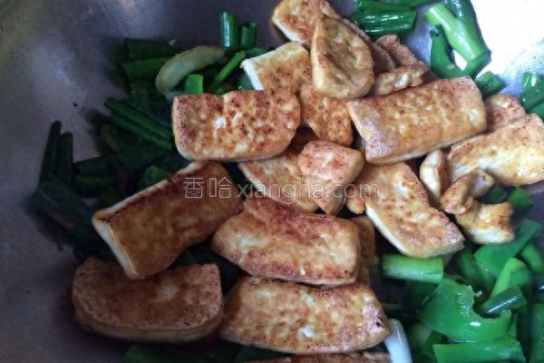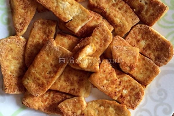 2、豆腐切片,平底锅煎至两面金黄,有一层脆皮,备用