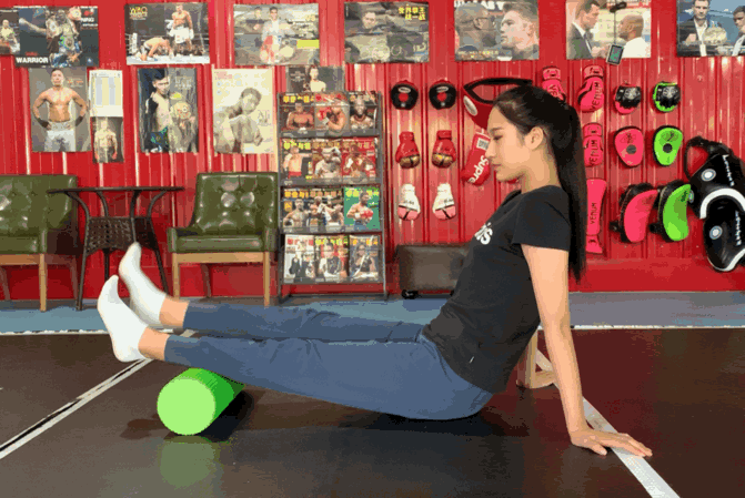 动 作 要 点:双腿小腿部位放于泡沫轴上,身体挺直,双手放于身体两侧坐在垫子上。