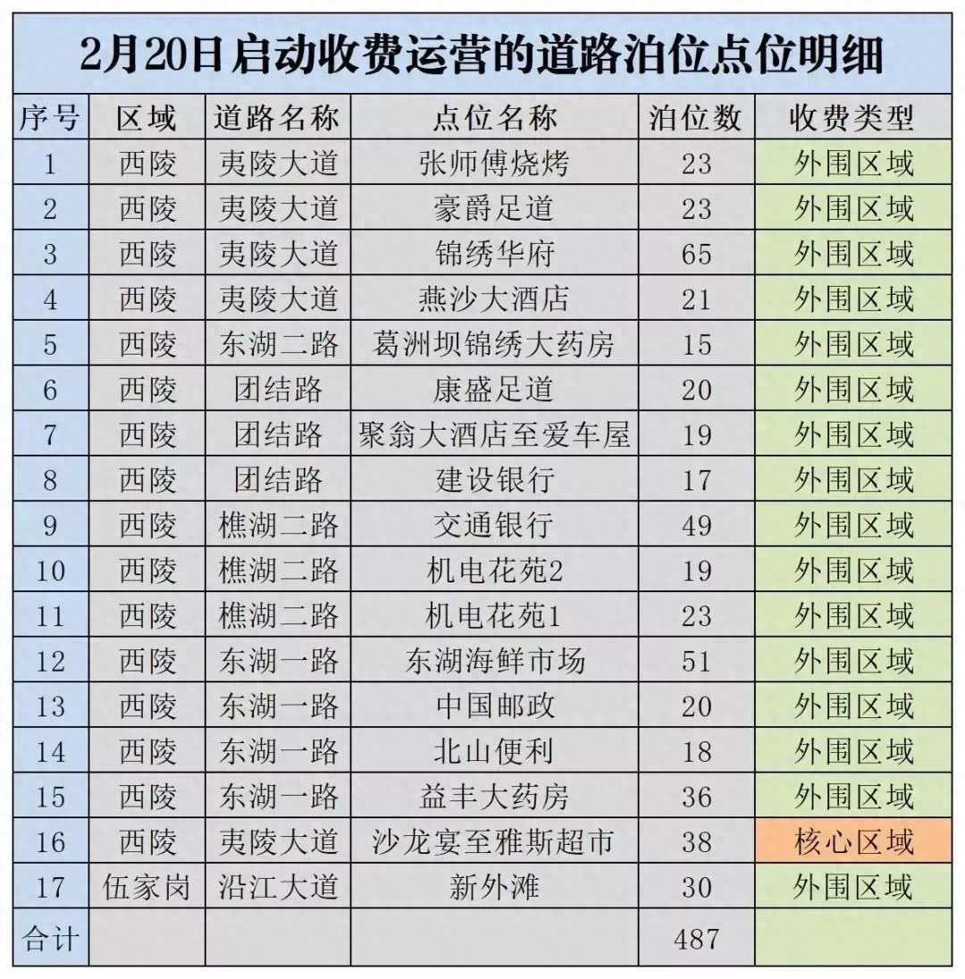 ● 位于夷陵大道、东湖二路、团结路、樵湖二路、东湖一路、夷陵大道、沿江大道的17个道路泊位点位,487个泊位,将于2月20日8:00起正式收费运营。