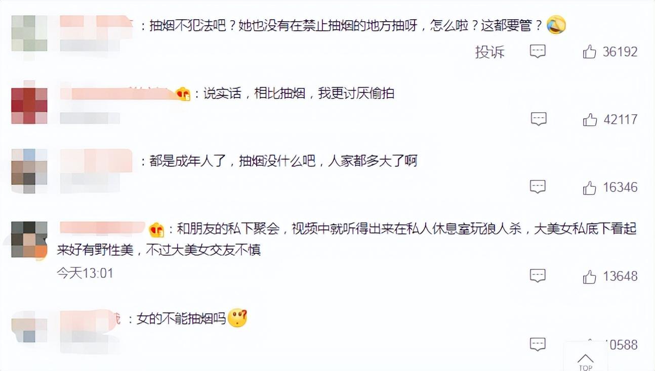让她想不到的是,她会因为这件事情上了热搜,还一度登顶,成为热门话题,很是诧异,网友们也是对她抽烟的行为进行了讨论,都觉得这并不是什么大事,抽个烟又不犯法,主要是觉得有人拍视频发到网上就不好了,觉得这属于偷拍,尤其还是私人聚会。