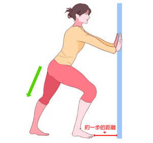 小腿肌群拉伸训练:一种是前后弓步,躯干前倾同时双手支撑墙面,后侧腿伸直,全脚掌着地,足跟不要抬离地面。