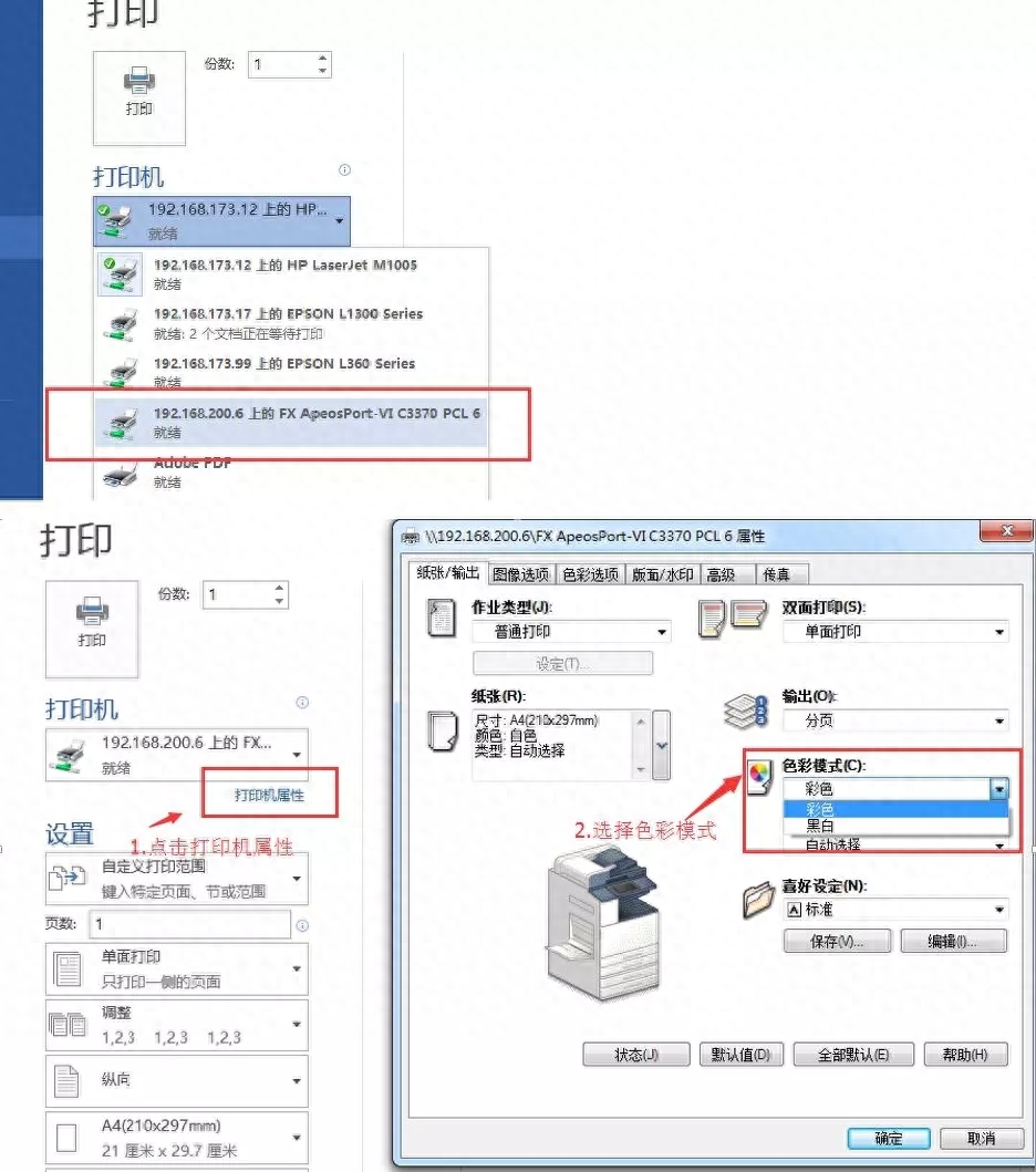 在打印时选择打印机下图上的 192.168.200.6 上的打印机,如需彩打参考右下图点选“打印机属性”,选择彩色模式-彩色