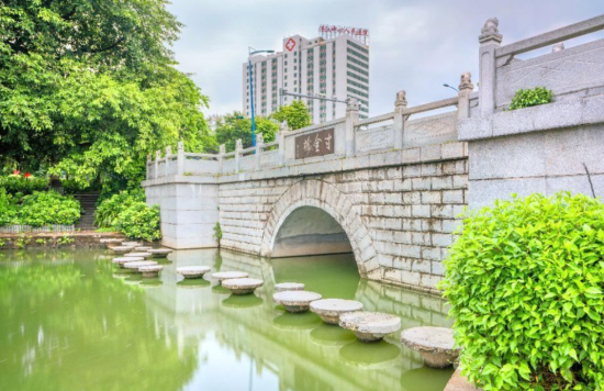 寸金桥坐落在赤坎区西侧,“寸金浩气”是湛江八景之一。1925年遂溪麻章区绅民所建,1959年重修。桥名含中华国土寸土寸金,不容外敌侵占之意,以纪念1898年当地人民的抗法斗争。重修后的寸金桥,为水泥铺面单孔石桥,长19米,宽12米,两侧各立栏柱18根,桥西头竖纪念碑1方,记抗法斗争事迹始末,有题字“一寸河山一寸金”与题诗“不甘俯首所瓜分,抗法人民组义军。黄略麻章皆创敌,寸金桥隔自由云”。