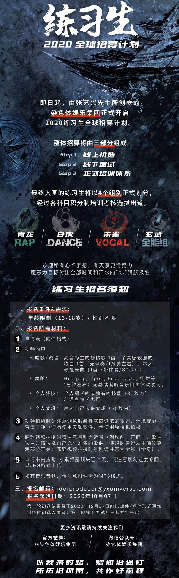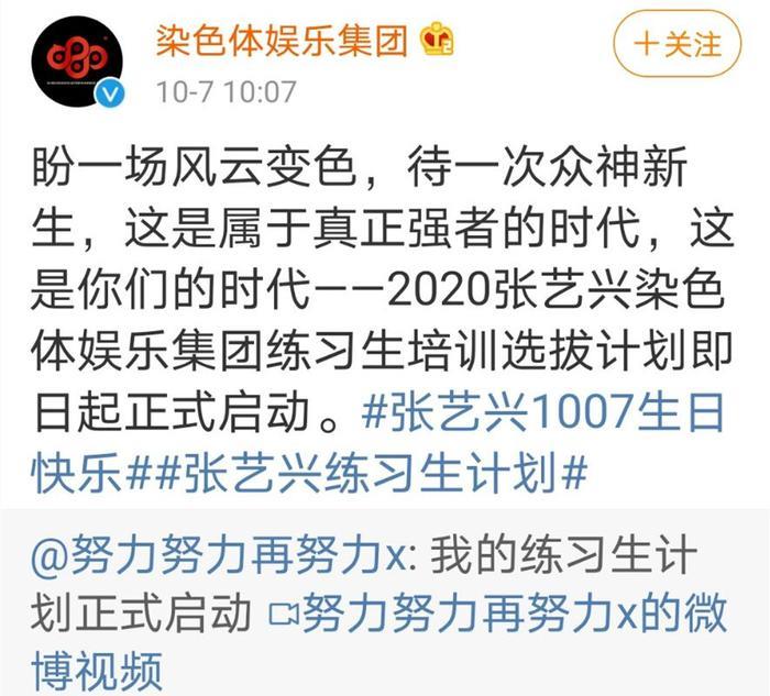 而在这条宣传视频发出之后,紧接着,张艺兴又转发了一条“染色体娱乐集团”的微博:内容就是“2020练习生全球招募计划”,看来这次张艺兴要自己的做主策划人,来做选秀活动。这可真是他生日的一份超级大礼了。