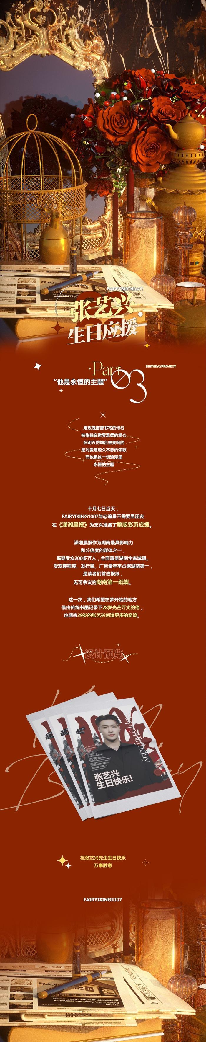 其次,粉丝们为张艺兴庆生。张艺兴的生日也成为了张艺兴粉丝的节日。大家的各种应援做得有声有色,我们除了在打开微博时能够看到张艺兴的微笑的脸庞以外,长沙的朋友们还能看到《潇湘晨报》为张艺兴做的专版庆生广告。