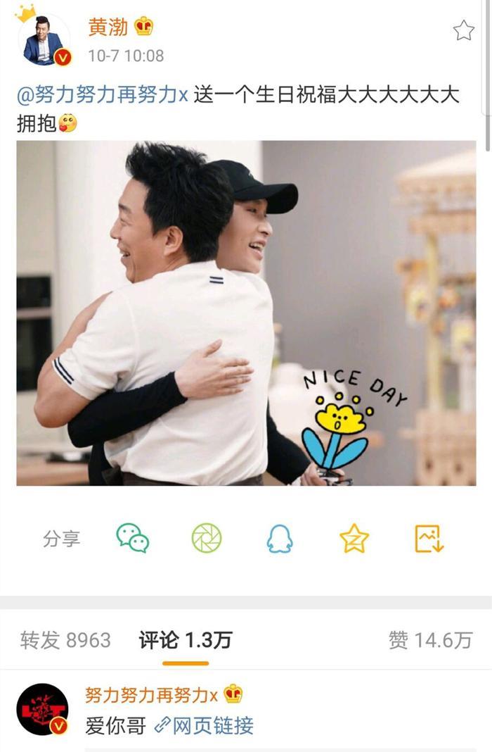 大忙人黄渤虽然很忙,但也不忘为兄弟庆生,发文表示“给一个生日祝福大大大大大大拥抱。”附图和张艺兴的拥抱,非常亲切。张艺兴也直接回复“爱你哥。”