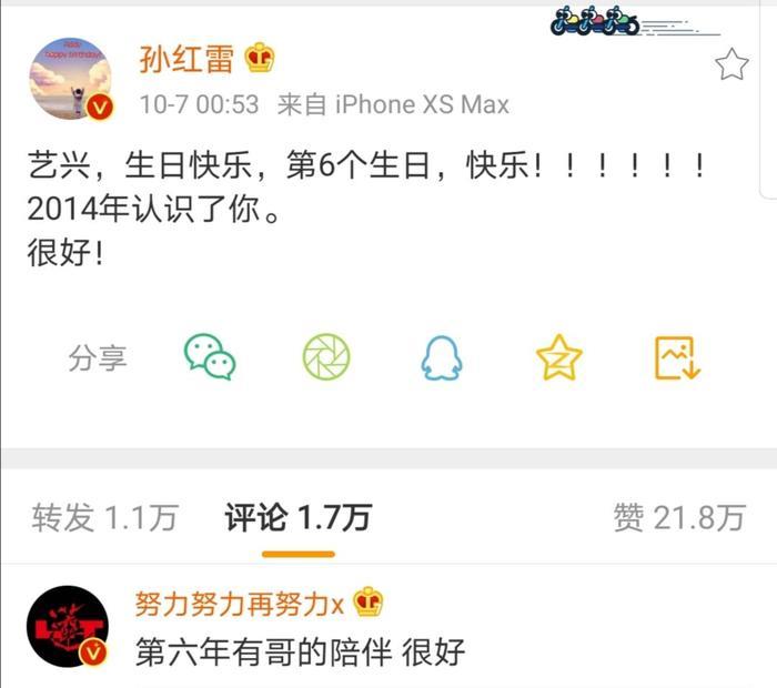 首先,张艺兴的“男人帮”好友集体为他庆生。孙红雷发文“艺兴,生日快乐,第6个生日,快乐!2014年认识了你。很好。”对此很多网友也纷纷评论,觉得孙红雷是不是喝高了?有点语无伦次,而且到底是第六年还是第七年呢?也是够搞笑了。张艺兴也给予了回复,他说“第六年有哥的陪伴,很好。”