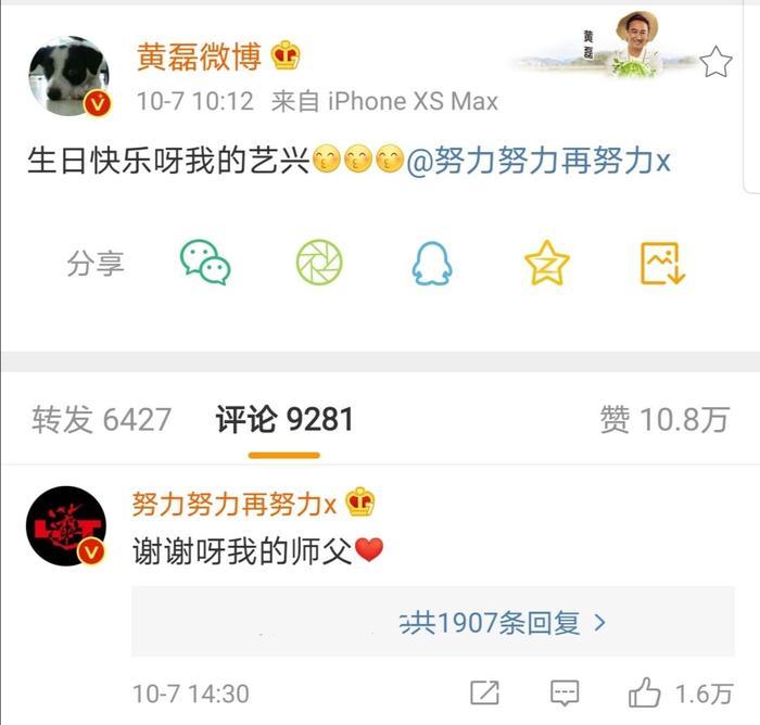 黄磊也发文表示“生日快乐呀我的艺兴。”张艺兴回复“谢谢呀我的师傅。”