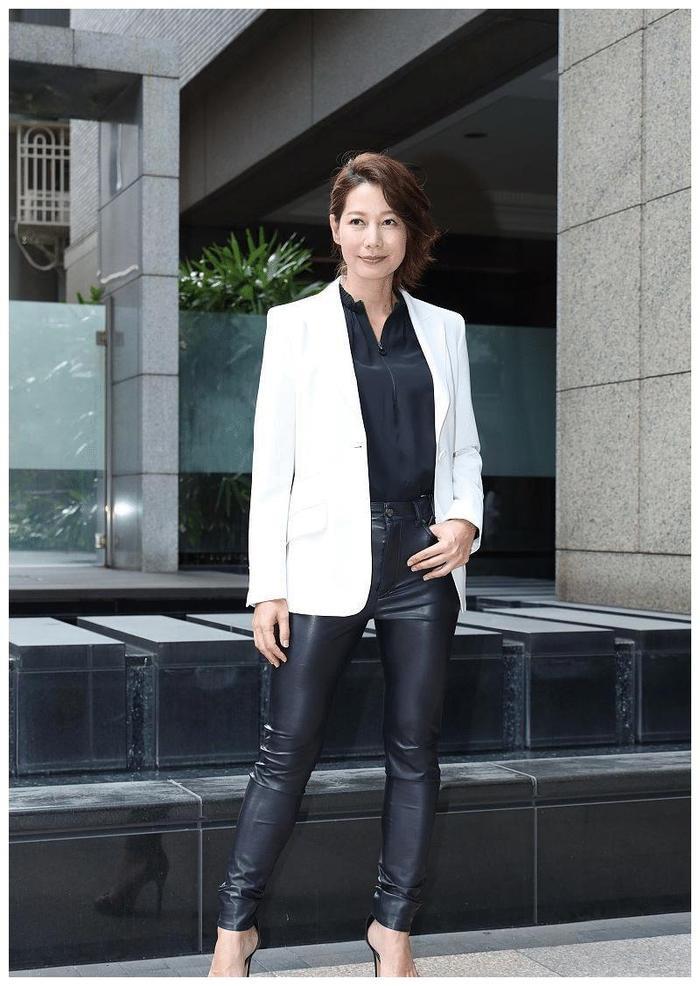 女性在西装穿搭中,就可以搭配皮裤,皮裤能让造型的酷帅气息变得更强,而且让穿搭在保持中性魅力的同时展现女人味。