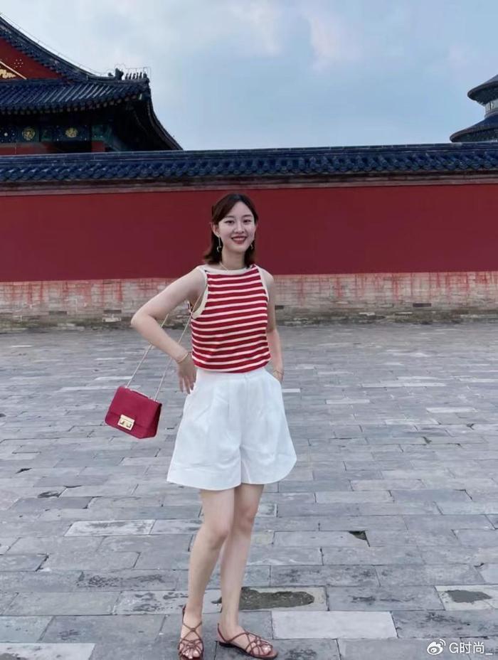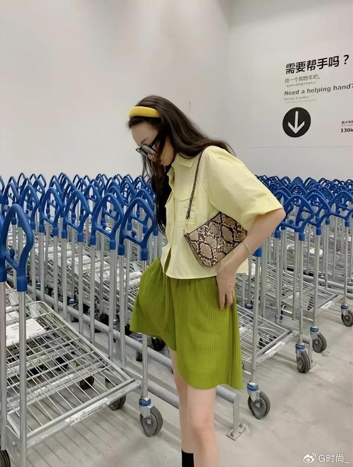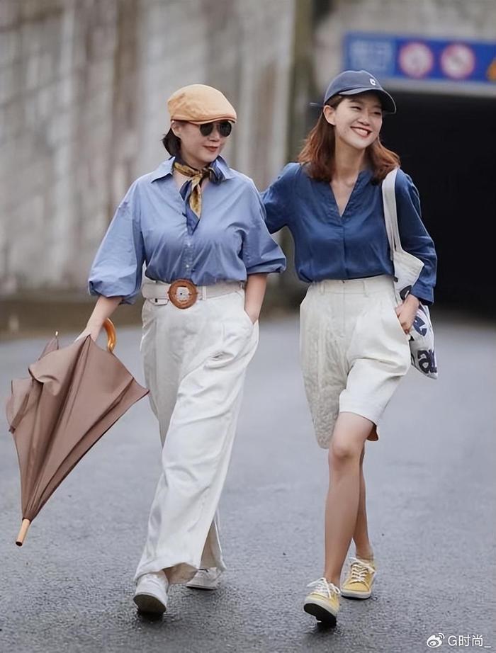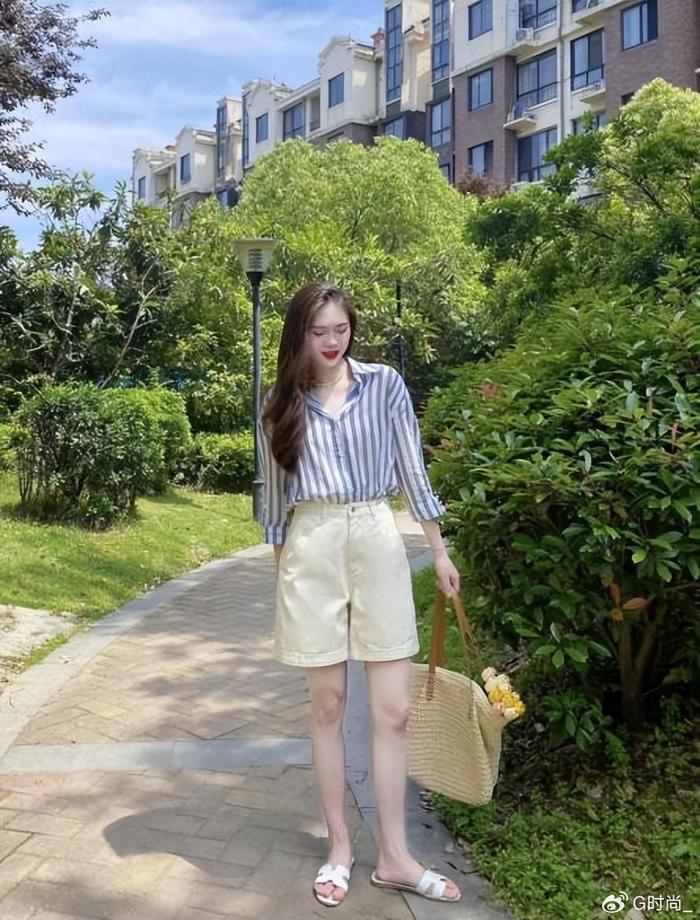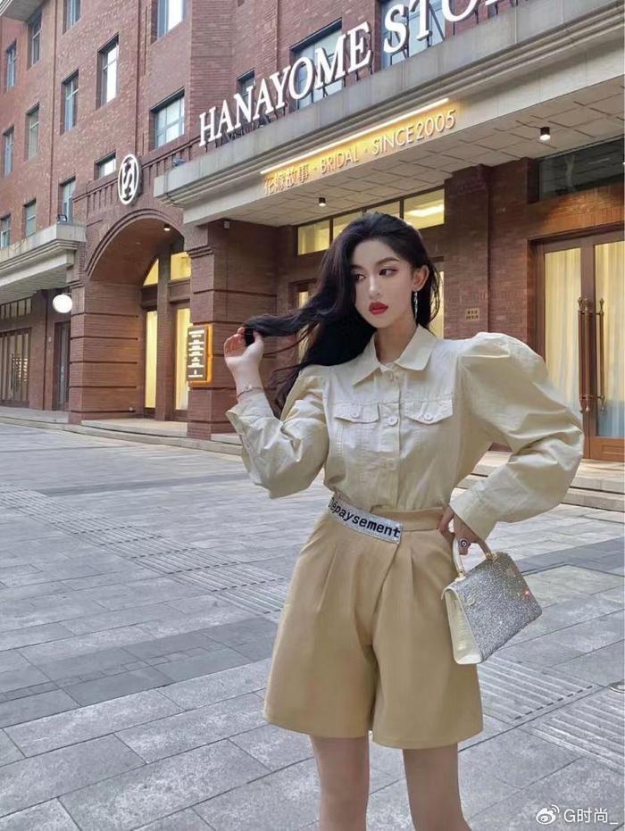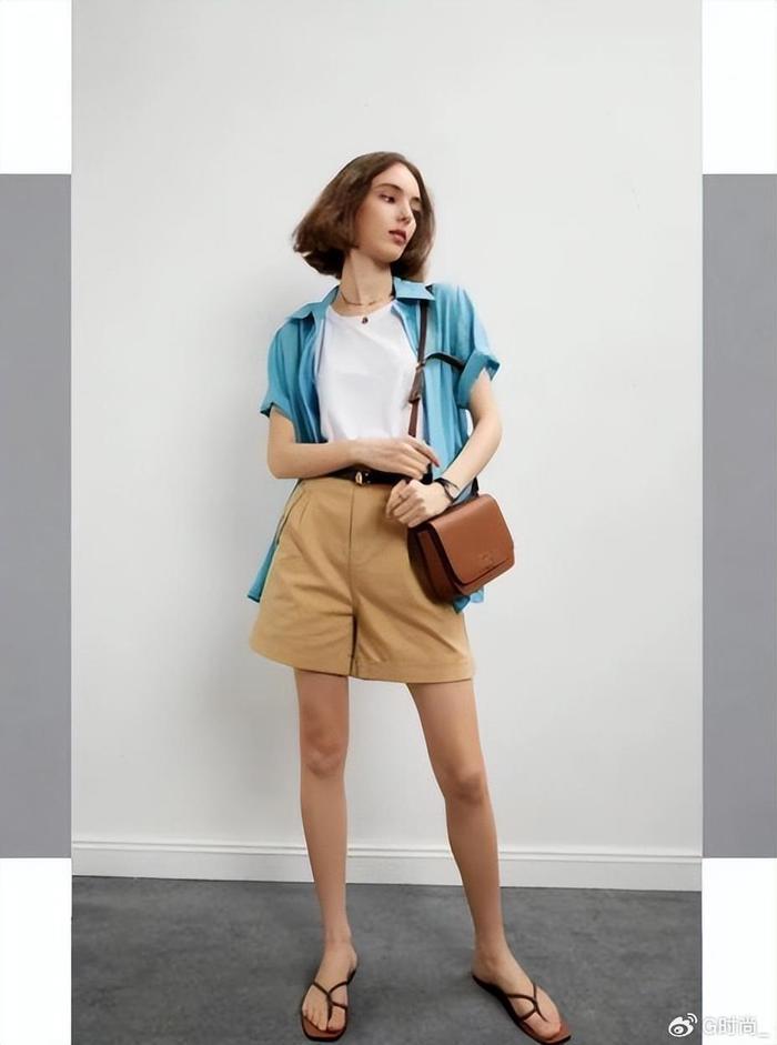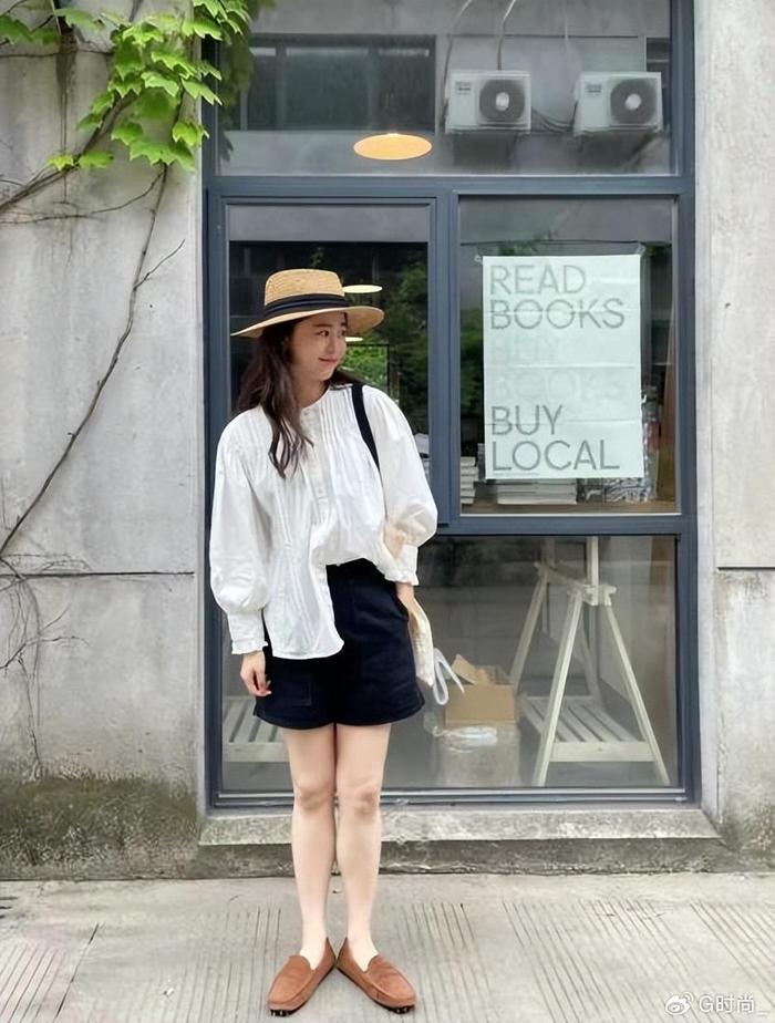 从整体上看,微微外阔的A型短裤并没有占用大面积搭配着装,毕竟不是阔腿裤款式,在大腿位置下留白显得裤装非常的轻便。但正是由于这样,整体着装的量感压缩,整个人会显得轻飘,只有在上装选择量感稍微大些的,比如灯笼袖、泡泡袖、有褶皱营造的堆积感设计的女性元素上身,才能令整体搭配拥有重心感,视觉上才会更协调。