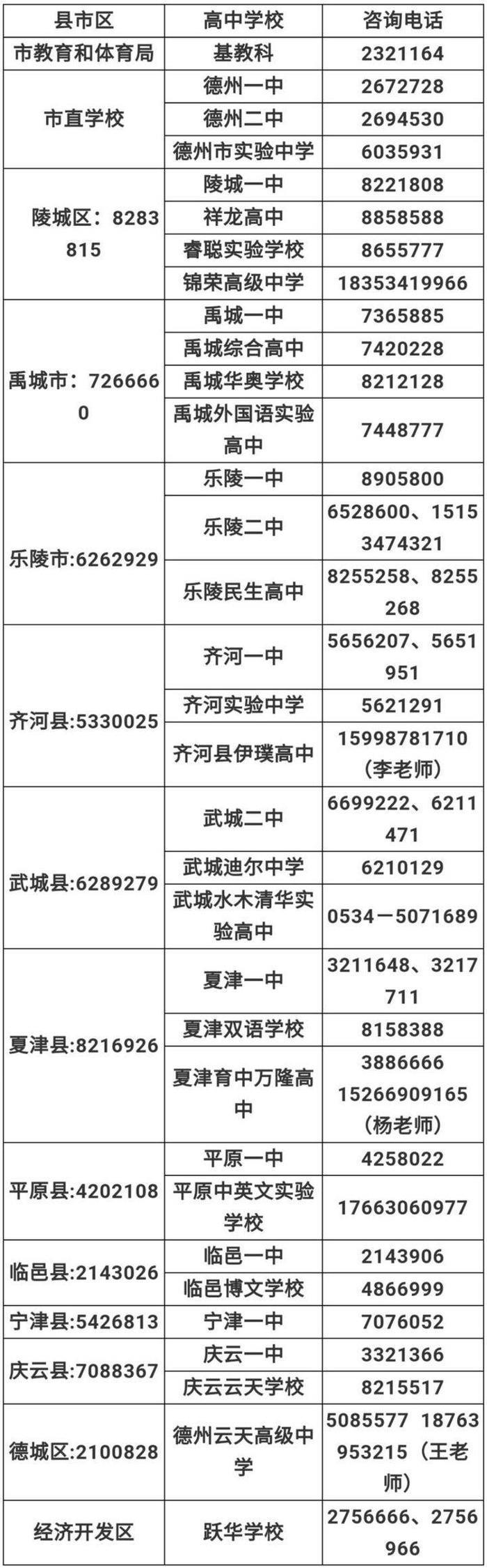 (二)禹城综合高中、齐河实验中学、乐陵二中录取工作,由学校属地县市区教体局负责并于7月17日前公布录取结果;考生可电话联系当地县市区教体局基教科或报考学校查询录取情况。