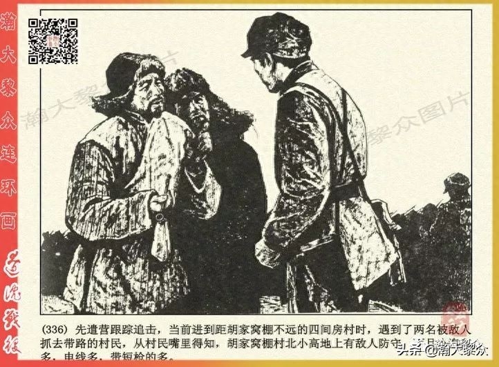 336 先遣营跟踪追击,当前进到距胡家窝棚不远的四间房村时,遇到了两名被敌人抓去带路的村民,从村民嘴里得知,胡家窝棚村北小高地上有敌人防守,而且小汽车多,电线多,带短枪的多。