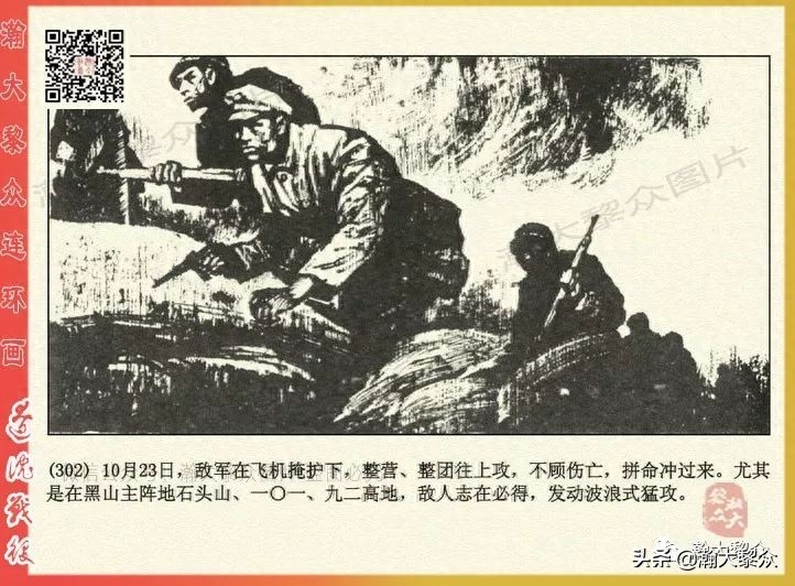 302 10月23日,敌军在飞机掩护下,整营、整团往上攻,不顾伤亡,拼命冲过来。尤其是在黑山主阵地石头山、一O一、九二高地,敌人志在必得,发动波浪式猛攻。