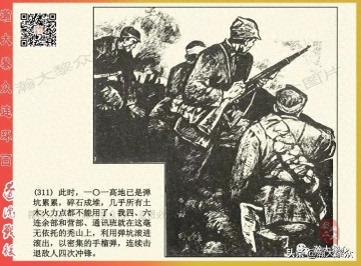 311 此时,一O一高地已是弹坑累累,碎石成堆,几乎所有土木火力点都不能用了。我四、六连余部和营部、通讯班就在这毫无依托的秃山上,利用弹坑滚进滚出,以密集的手榴弹,连续击退敌人四次冲锋。
