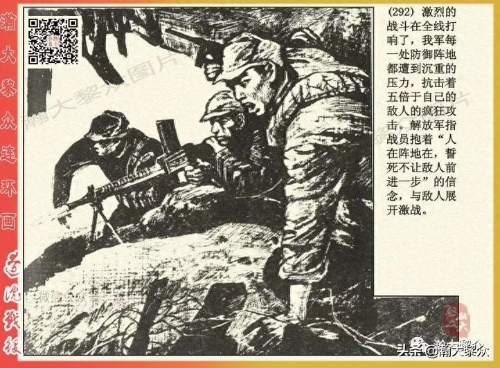 292 激烈的战斗在全线打响了,我军每一处防御阵地都遭到沉重的压力,抗击着五倍于自己的敌人的疯狂攻击。解放军指战员抱着“人在阵地在,誓死不让敌人前进一步”的信念,与敌人展开激战。