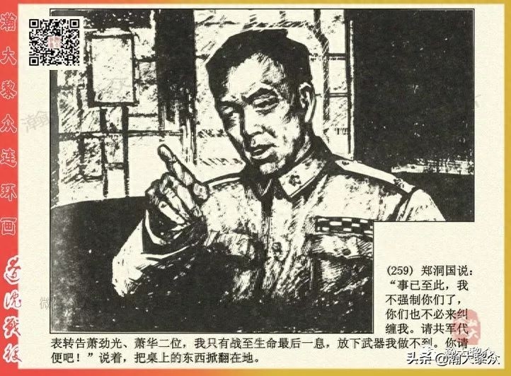 259 郑洞国说:“事已至此,我不强制你们了,你们也不必来纠缠我。请共军代表转告萧劲光、萧华二位,我只有战至生命最后一息,放下武器我做不到。你请便吧!”说着,把桌上的东西掀翻在地。