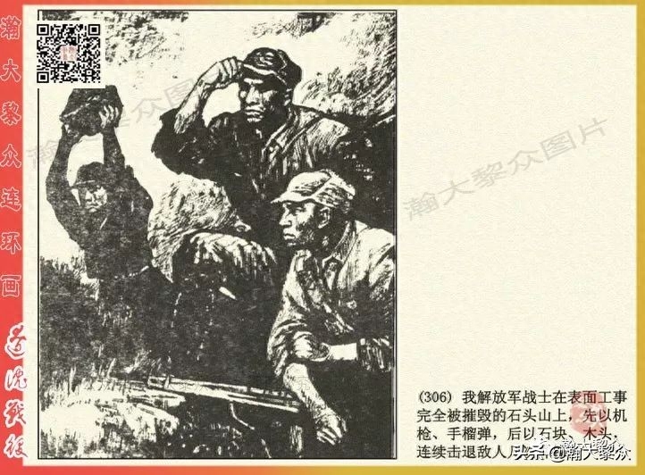 306 我解放军战士在表面工事完全被摧毁的石头山上,先以机枪、手榴弹,后以石块、木头,连续击退敌人几次冲锋。