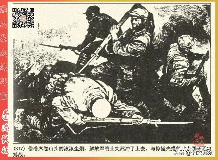 317 借着席卷山头的滚滚尘烟,解放军战士突然冲了上去,与惊慌失措的敌人展开肉搏战。